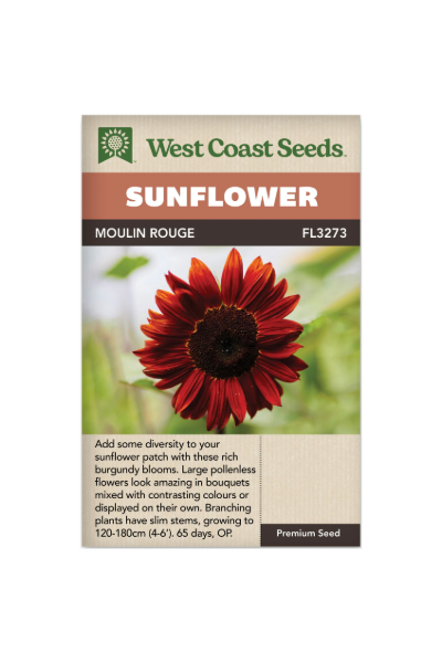 Add some diversity to your sunflower patch with these rich burgundy blooms. surrounding nearly black centers. Moulin Rouge’s large 6” pollenless flowers look amazing in bouquets or displayed on their own. Branching plants have slim stems, growing to 120- 180cm (4-6’).